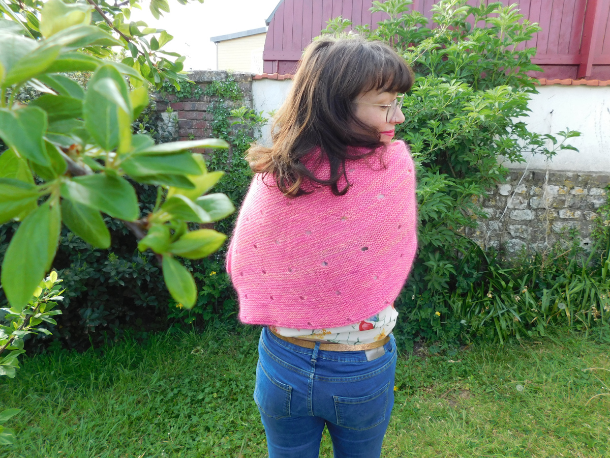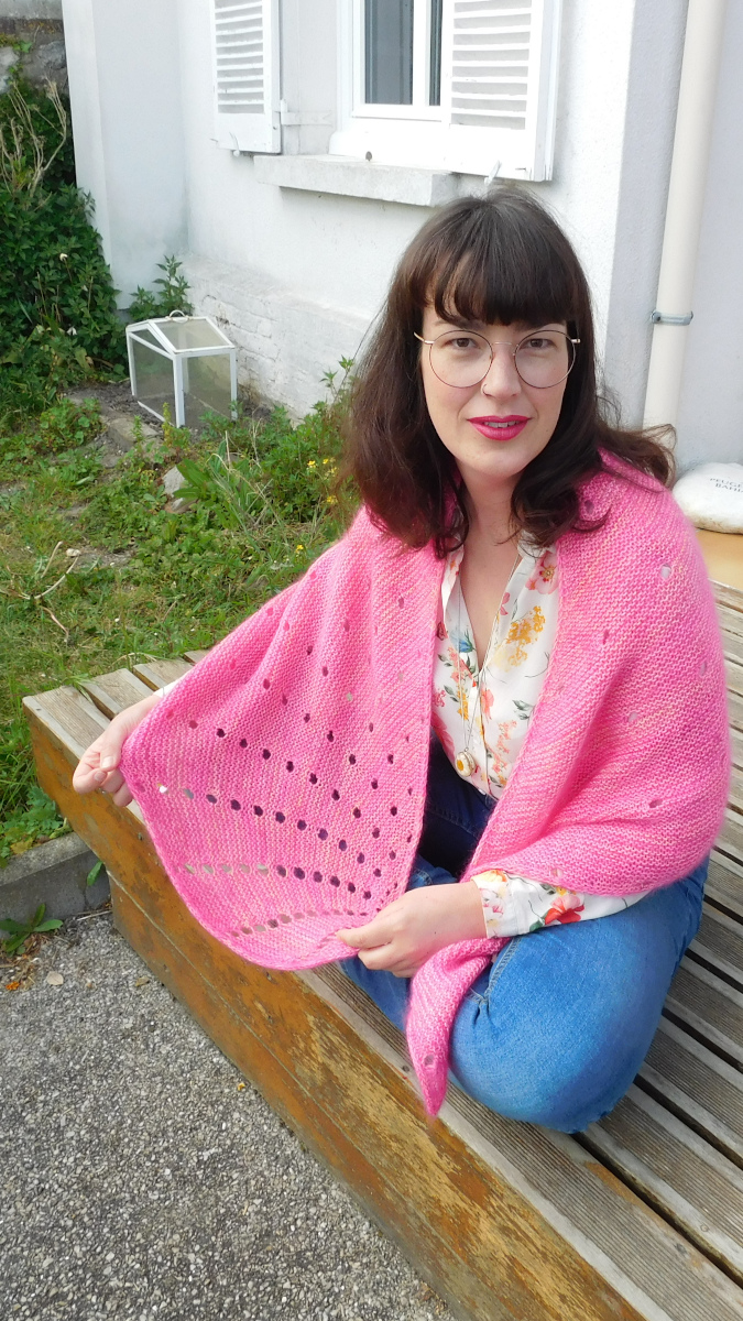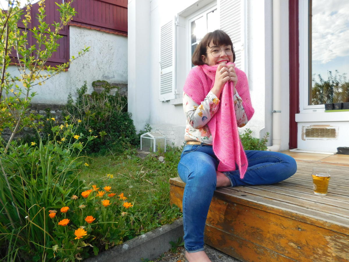 Je suis bien contente de ce joli châle qui est très agréable à tricoter et vivement la fin de ce maudit confinement pour que je puisse le porter à tous les barbecues et autres apéros dans l’herbe qui nous attendent cet été !