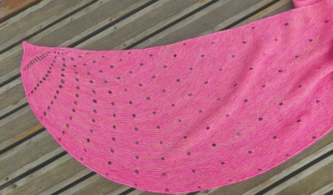 Le choix des couleurs me plaît beaucoup, le flamingo était déjà bien vif et le mohair fuschia un peu plus foncé le relance bien ! C’est une belle harmonie ! En tout, il m’a fallu environ un écheveau et demi de Tough Sock et deux écheveaux de Tribblettes pour réaliser mon Dotted Rays. Ce châle se bloque facilement (même s’il faut quand même un peu de place!), je pense que l’I-cord aide bien à avoir un contour très élastique, et surtout, il n’y a que très peu de fils à rentrer !!!