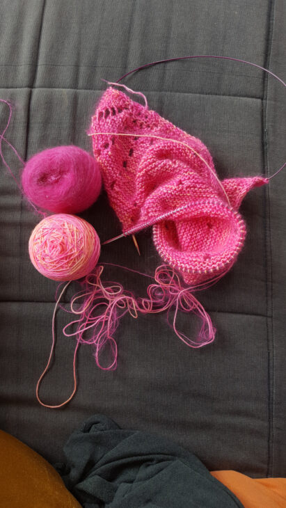 Plus tard, et même beaucoup plus tard, en réalisant l’échantillon, grosse déception : la laine était clairement trop fine (je tricote très serré) ! Comme je n’avais ni envie d’un châle plus petit, ni envie de changer d’avis et qu’entre temps, un an s’était passé, j’ai décidé de choisir deux écheveaux supplémentaires de mohair très fin au festival d’Edimbourg 2019 cette fois :) J’ai trouvé ce que je cherchais chez Easy Knits, sans trop de surprise puisqu’ils sont vraiment à fond sur les couleurs flashy : leur gamme Tribblettes correspondait exactement à ce qu’il me fallait : 72% de mohair, 28% de soie en rose ultra flashy !