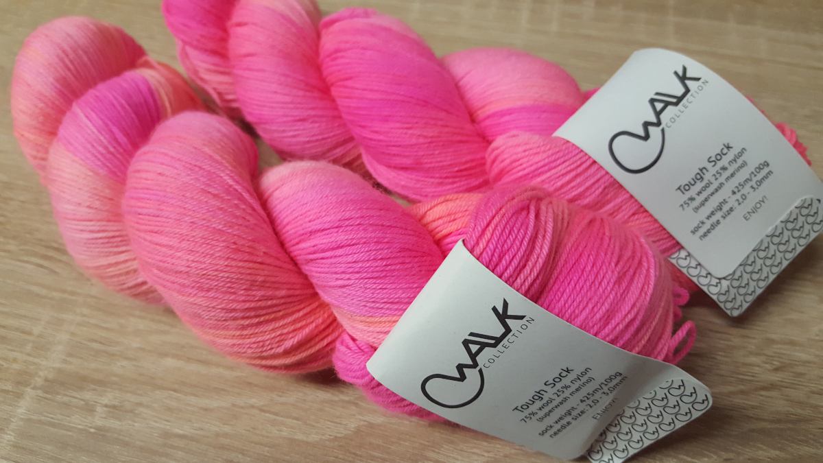 C’est en divagant sur Ravelry que j’ai littéralement flashé sur le sur la petite version du Dotted Rays toute verte fluo tricotée par Stephen West lui-même ! Vous pouvez aussi la voir ici si vous commettez l’erreur de ne pas être sur Ravelry ;) Quelle beauté ! Ce projet était donc bien inscrit sur ma to do list et j’ai profité du festival de tricot d’Edimbourg 2018 pour me procurer une laine qui corresponde à ce que je voulais faire. J’ai trouvé cette laine sur le stand de Walk Creation, une marque de laine allemande (gérée par des personnes très sympas !) : leur gamme Tough Sock en coloris Flamingo.