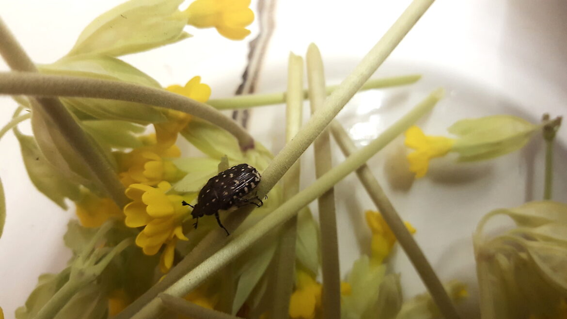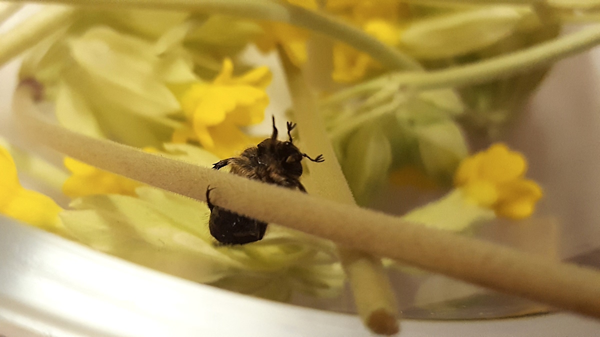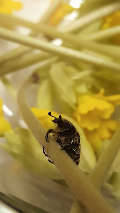 Voici un petit insecte observé début avril en Loire-Atlantique ! Comme vous pouvez le voir, il avait dû s’installer dans les coucous que j’avais ramassé pour la gelée de coucous annuelle !