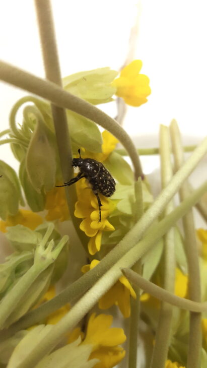 La cétoine grise consomme beaucoup de fleurs, et notamment de bourgeons de fleurs (par exemple vos rosiers mais aussi arbres fruitiers et compagnie)… De ce fait, même si elle contribue à la pollinisation, elle est considérée comme nuisible. Beaucoup de cétoines peuvent faire beaucoup de dégâts sauf si la scolie hirsute, une guêpe comme son nom ne le laisse pas deviner, est présente. Le monde animal est parfois bien trash et nous en avons encore un exemple ici puisque la scolie hirsute pond ses œufs DANS les larves de cétoines qui éclosent ensuite à l’intérieur et les mangent en les empêchant, de fait, de devenir adulte et de manger vos rosiers CQFD + #bonappétitbiensûr. Moins polluante que les pesticides pour réguler les cétoines, malheureusement, la scolie hirsute est actuellement en voie de disparition…